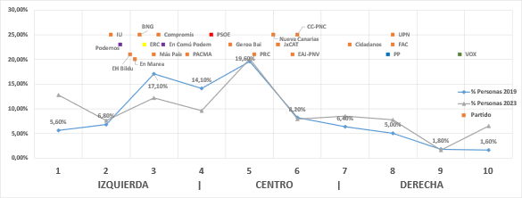 Ilustración 1 Distribución de la percepción de la población sobre los partidos en la escala ideológica (CIS 2019) y distribución porcentual de la población por preferencia ideológica (CIS 2019) y (CIS 2013). 1-Izquierda, 10-Derecha.